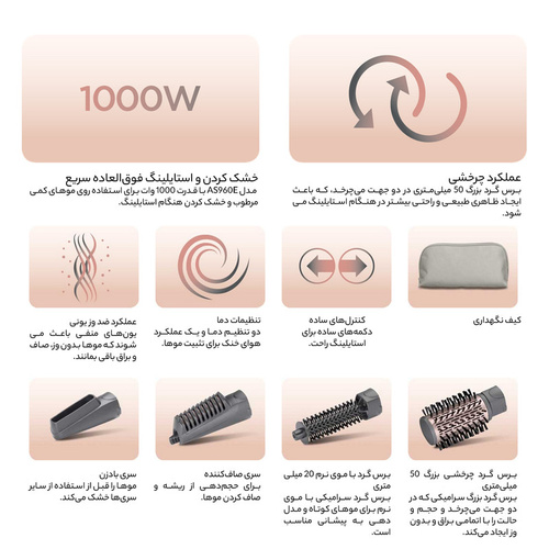 یکی از برترین محصولات شرکت بابیلیس سشوار چرخشی AS960E میباشد که ابتدا با کد AS960SDE تولید شد و چند سال بعد با برطرف نمودن اندک ایرادات جزئی و موتور بهینه شده با کد AS960E روانه باز شد و بدلیل کیفیت و کارایی به یکی از پروفروشترین سشوارهای چرخشی تبدیل شد. طراحی بدنه دستگاه ارگونومیک، سبک و زیبا است. این مدل دارای 4 سری مجزا میباشد،:برس سرامیکی گرد چرخشی 50 میلیمتری وبرس ثابت 20 میلیمتریوسری صاف کننده شانه ایی با دندانه های سرامیکی و نازل خشک کن مو است. این 4 سری امکان خشک کردن مو صاف کردن مو حجم دهی و حالت دهی به موها را بخوبی انجام میدهند. این دستگاه با وجود سایز لارج از وزن مناسبی برخوردار است و بسیار خوش دست میباشد که در حین کار دست احساس خستگی نمیکند. از دیگر مشخصات این دستگاه موتور DC قدرتمند 1000 واتی میباشد که به محافظت کننده دمای بالا تجهیز شده است. روی سشوار دکمه دو طرفه ایی تعیبه شده که باعث چرخش به چپ و راست برس میشود. این دستگاه دارای سیم بلند 2 متری با قابلیت چرخش 360 درجه برای راحتی حین کار میباشد.به همراه این مدل یک کیف مخصوص برای نگهداری سشوار و حمل راحت تر دستگاه ارائه شده است. از ویژگی های خوب سشوار چرخشی بابلیس می توان به تولید یون های منفی اشاره کرد؛ تولید یون موجب خشک شدن سریعتر موها و ایجاد لطافت و نرمی بیشتر مو خواهد شد. البته تولید این یون های منفی، مانع از آسیب رسیدن به موهای شما هنگام استفاده از دستگاه خواهد شد. این مدل در مقایسه با دستگاههای مشابه از کیفیت ساخت و راندمان بالاتری بهره میبرد و عیب و ایرادی نمیشود گرفت بهمین دلیل در میان مدلهای متنوع و گوناگون سشوارهای چرخشی بابیلیس حتی با قیمتهای بالاتر این مدل پر فرشروترین محصول بابیلیس میباشد. چنانچه قصد خرید سشوار چرخشی از محصولات رده بالا را دارید این مدل انتخاب ایده آلی میباشد