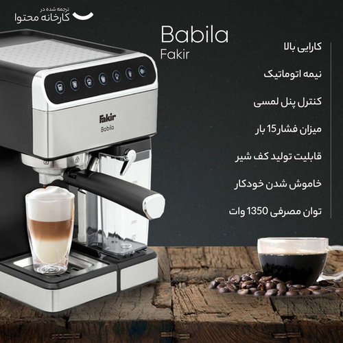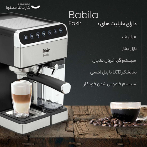 دستگاه Babila ساخت شرکت فکر آلمان میباشد.دستگاه فوق یک دستگاه تمام اتوماتیک مجهز به صفحه نمایش ال سی دی لمسی میباشد که تنها با لمس صفحه تنوع بی نظیری از اسپرسو و ترکیبات آن را در اختیار شما میگذارد.این دستگاه دارای مخزن شیر بوده و به صورت تمام اتوماتیک برای شما کاپوچینو و لاته به حالت چندرنگ و طبقه ای آماده میکند. فشار بخار دستگاه 15بار بوده و جنس دستگاه از استنلس استیل میباشد. دستگاه همزمان میتواند دو فنجان اسپرسو را آماده کند.همچنین میتوانید از روی صفحه لمسی دستگاه انداره لیوان خود را انتخاب فرمایید. روی دستگاه صفحه ای تعبیه شده است که فنجان های شما را به سرعت گرم میکند. دستگاه Babila دستگاهی بسیار زیبا و کارآمد برای آشپزخانه شماست که لذت نوشیدن نوشیدنی هایی را که تهیه آنها سخت و وقت گیر است را در حد لمس یک کلید برای شما راحت نموده است.
